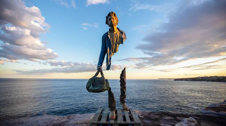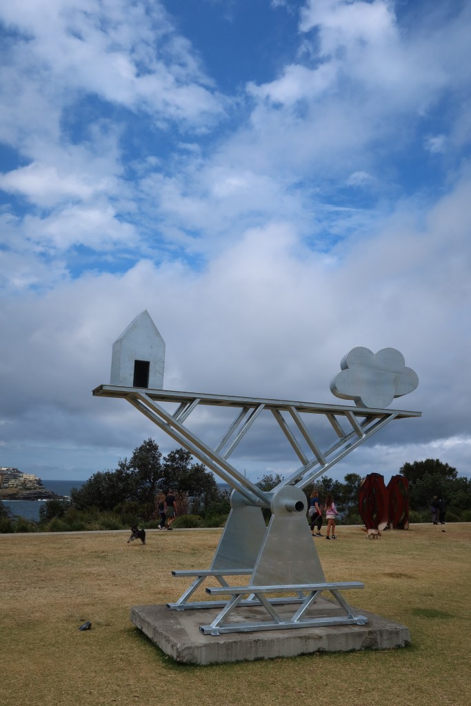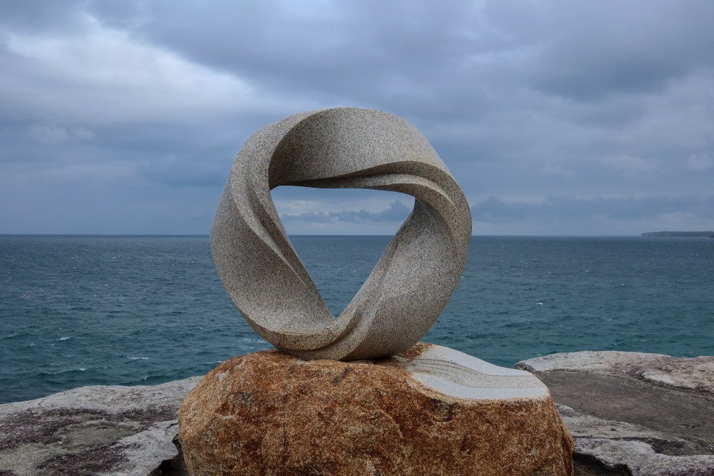Sculpture by the Sea根据官网自己介绍是全球最大的免费对公众开放的户外雕塑展,资金一部分(20%)来自于政府援助,一部分来自于商业伙伴(展板上看到好几家本地酒庄和材料环保公司)和个人捐助者。从1997年的一天展览开始,到今日数个地方同时展览几万人次的大规模,正好是二十五年。我们去的是Bondi展区,雕塑们沿着beach walk path被安置在岩石上山崖上,面对不停冲击海边的海浪,在阴雨天更多出一丝孤寂感。