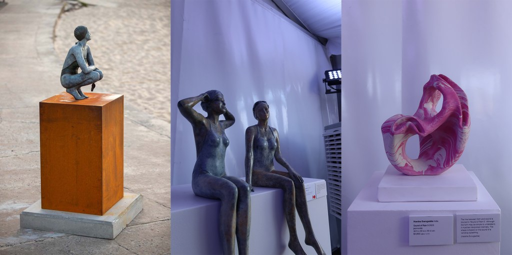 事先看到了卖场里的小型雕塑,两个戴着泳帽泳镜的女孩坐在展台上,在室内蓝盈盈的光线下有种梦幻的柔和美感。之后再看到室外这座,海边蹲着的游泳女孩,出现再合理不过,会想到午后,很美。Sound of Rain这件也是展厅内看到一眼相中,以雨滴溅开的声音作为形状,看不出来是一个印度大哥的作品。和友心动想买,看了眼价格3800买不起380可能就买了……