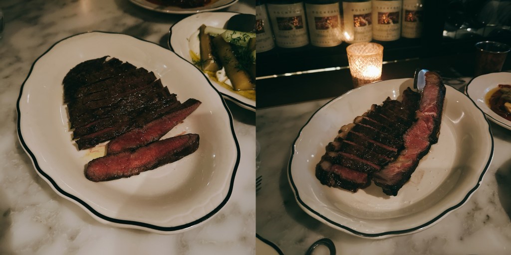 本次的主角终于堂堂登场——左边是full blood wagyu flat iron MB8+ 250g,引用一下菜单介绍:使用产自西澳的top黑毛和牛Mayura Station,从小喂养由谷物和巧克力组成的饲料,成品的牛肉自带坚果香气和黄油质地;右边是42 day dry aged bone in Sirloin MB3+ 500g,没问火候直接做了最佳处理medium rare,不同的好吃但真的都好好吃!平时吃完上一道牛骨髓配面包有个六分饱,按说吃完肉要撑的慌,但这次轻松解决却不会感到负担。我有限的词汇量和平庸的语言组织能力形容不出到底有多好吃,硬要说的话就是一个人想象中对好吃的牛排是什么样的认知,那这牛排就是有那么好吃甚至可能更多一点美味。sauce给了一个chili olive oil的,牛排配酱不配酱都好吃,就是肉好到不单吃会觉得浪费品质。