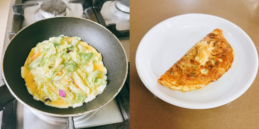 做饭真的是个很有成就感的事,把错买来不吃的现成沙拉蔬菜包(卷心菜、紫色的那个沙拉菜和胡萝卜丝)切碎,打两个鸡蛋拌一起,撒盐和胡椒粉煎,另加了两片芝士,煎成蛋饼味道竟然还行。不过下次学会不加芝士或者少加一片了,翻面的时候太油黏黏糊糊。