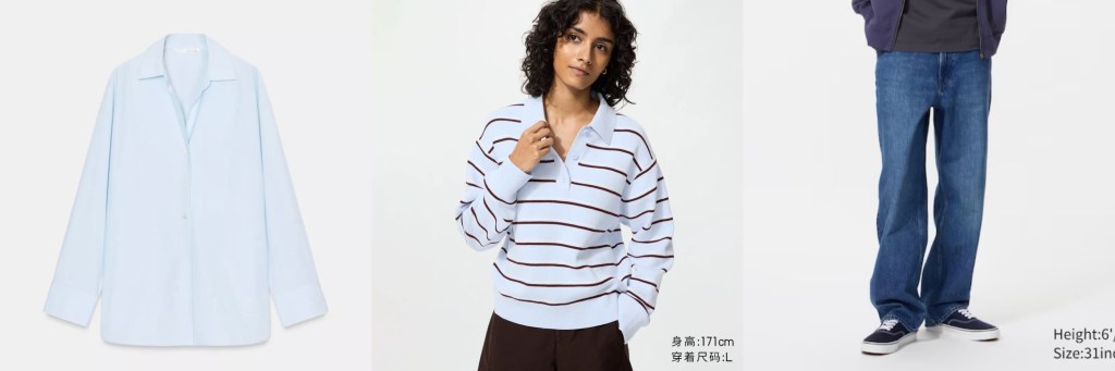 照片里不太明显其实这件衬衫带着很浅的蓝色条纹,领口是偏低的 V 领设计,上半部分的纽扣外露,下半做了暗扣,细节很克制,也是这次最偏工服的一件。